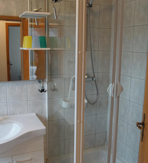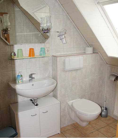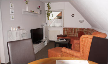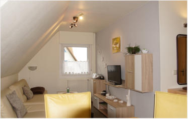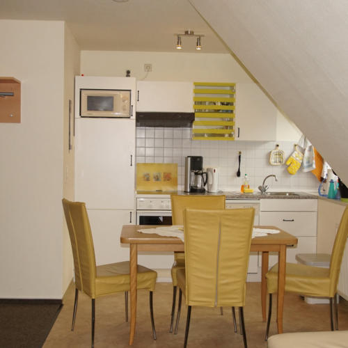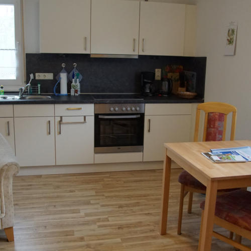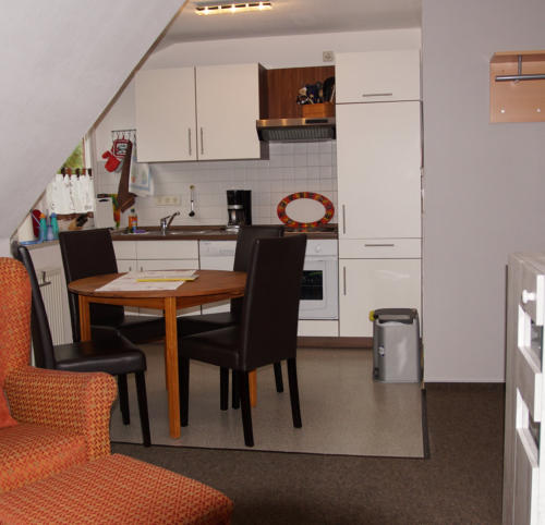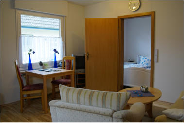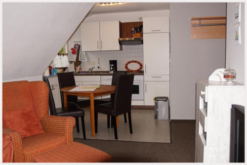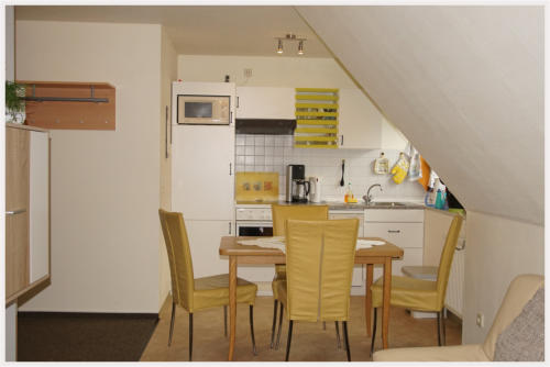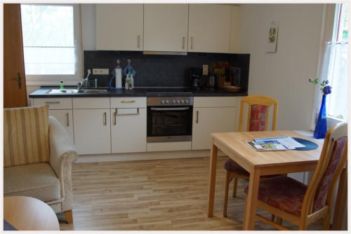 Es ist eine grosszügig geschnittene Ferienwohnung 45 m² für bis zu 4 Personen im 1. OG. Sie beinhaltet einen Schlafraum, einem kuscheligen Wohnbereichmit Sat-TV, Radip/CD, reichlich Gläser für diverse Getränke und eine unfangreiche Spielesammlung für jung und alt.Angrenzend befindet sich eine voll ausgestattete Küchenzeile, mit E-Herd + Backofen, Spülmaschine, Mikrowelle, usw..Alle Kochhilfsgeräte sind ebenfalls vorhanden, inklusiv ausreichend Geschirr.Eine gemütliche Essecke für 4 Personen hat im Küchenbereich auchihren Platz.