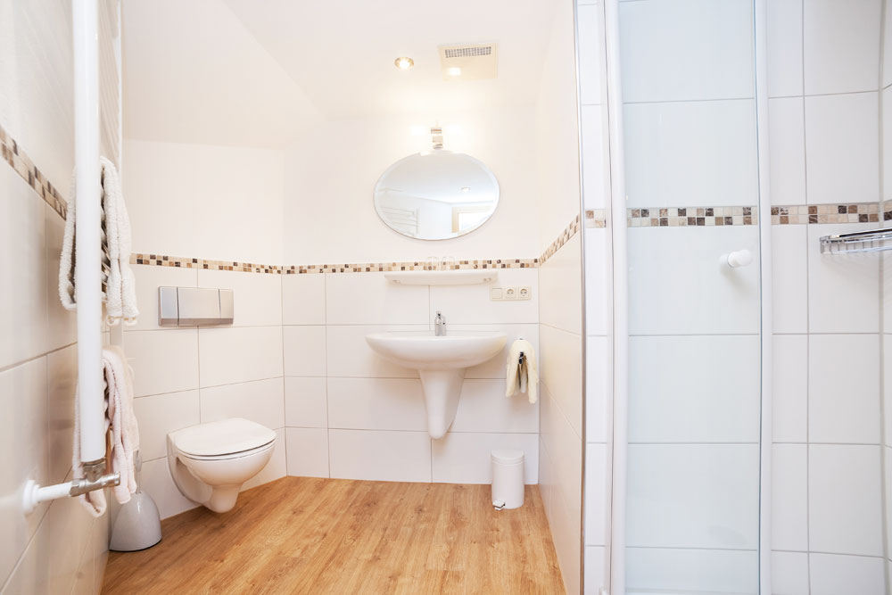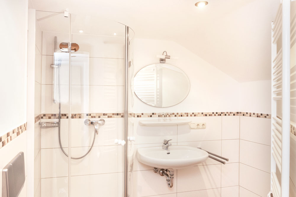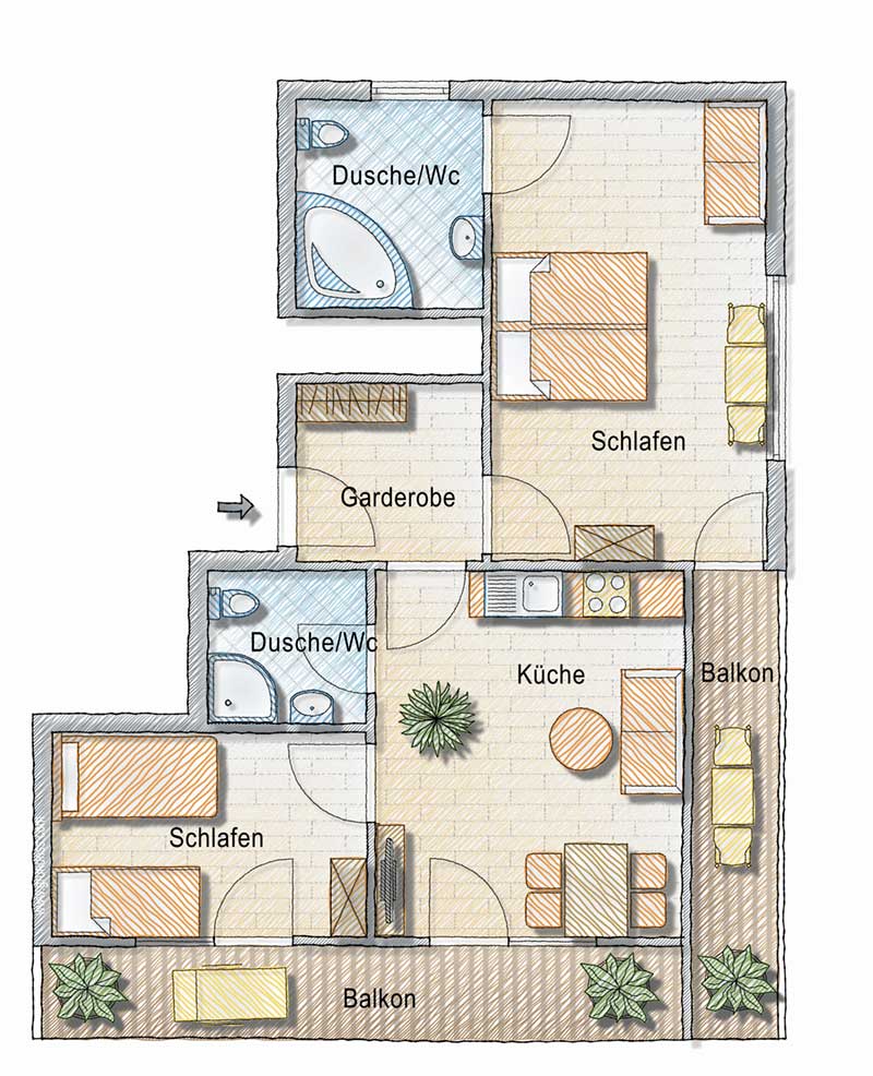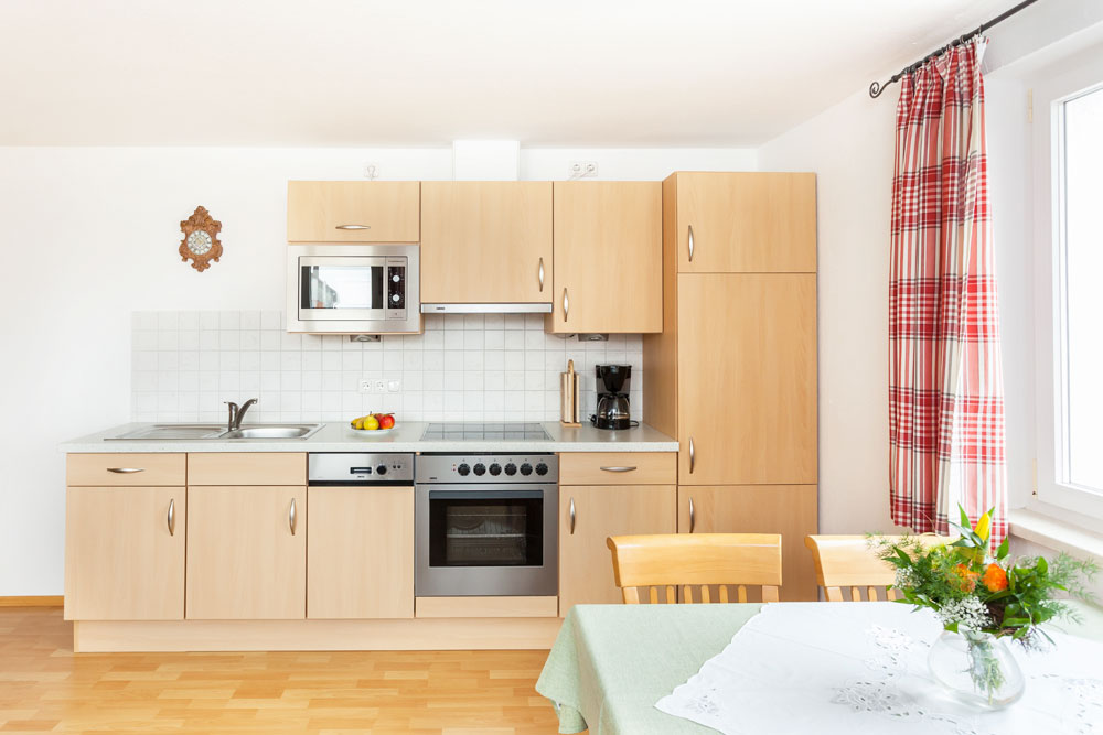 Die Ferienwohnung Flieder liegt im 1. OG und ist ideal auch für Familien geeignet. Die Wohnung besteht aus zwei Schlafzimmern, einer Küche mit Essecke sowie zwei Dusche / WC. Zur Ausstattung gehört zudem ein TV sowie ein sehr schöner Ost- und Südbalkon. Die Küche ist ausgestattet mit Spülmaschine, Backofen und Mikrowelle.
