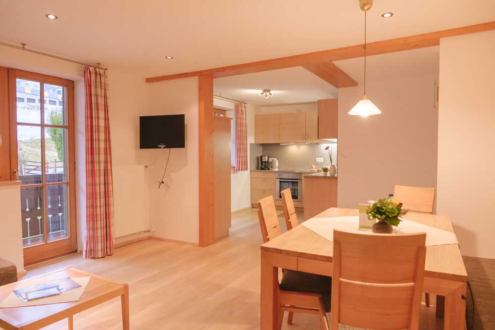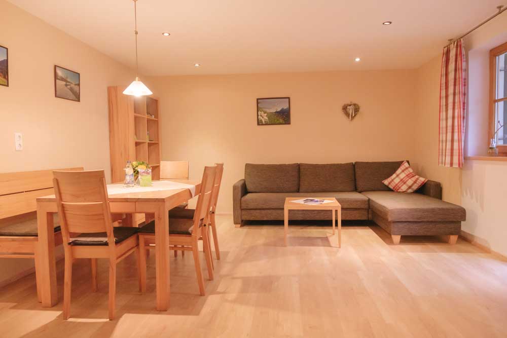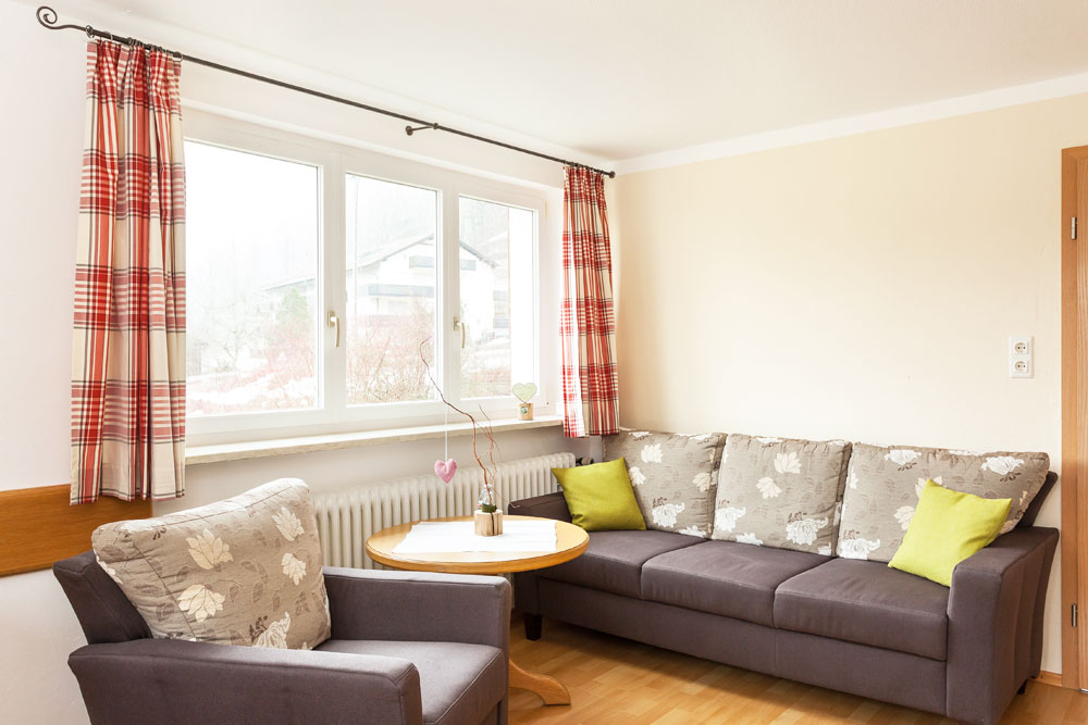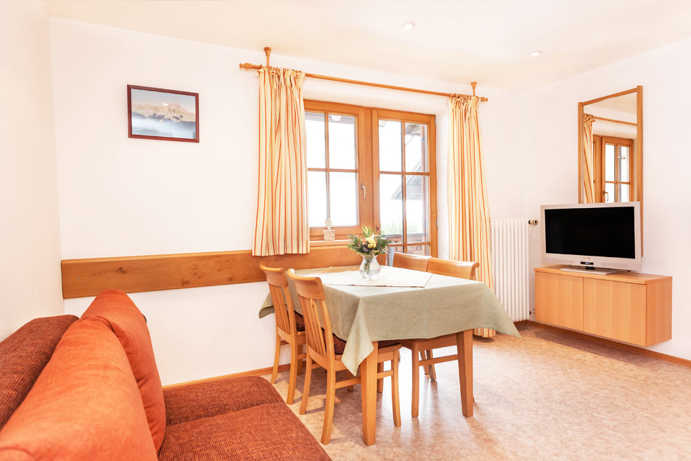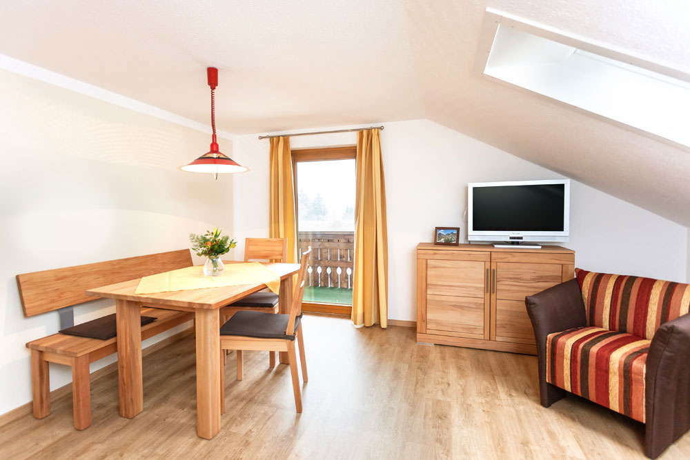 Die Ferienwohnung Blumenwiese liegt im Erdgeschoss und verfügt über einen eigenen Eingang sowie eine schöne Ostterrasse. Zu der Wohnung gehören zwei Schlafzimmer, ein Bad mit Dusche und WC sowie eine Wohnküche mit Essecke und zusätzlichen Sitzgelegenheiten mit TV. Die Küche ist ausgestattet mit Spülmaschine, Backofen und Mikrowelle.