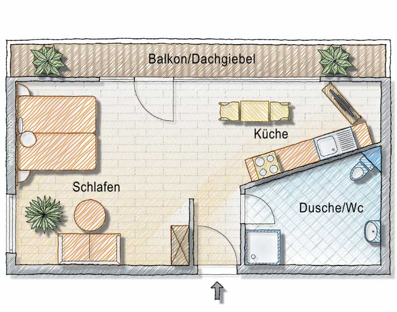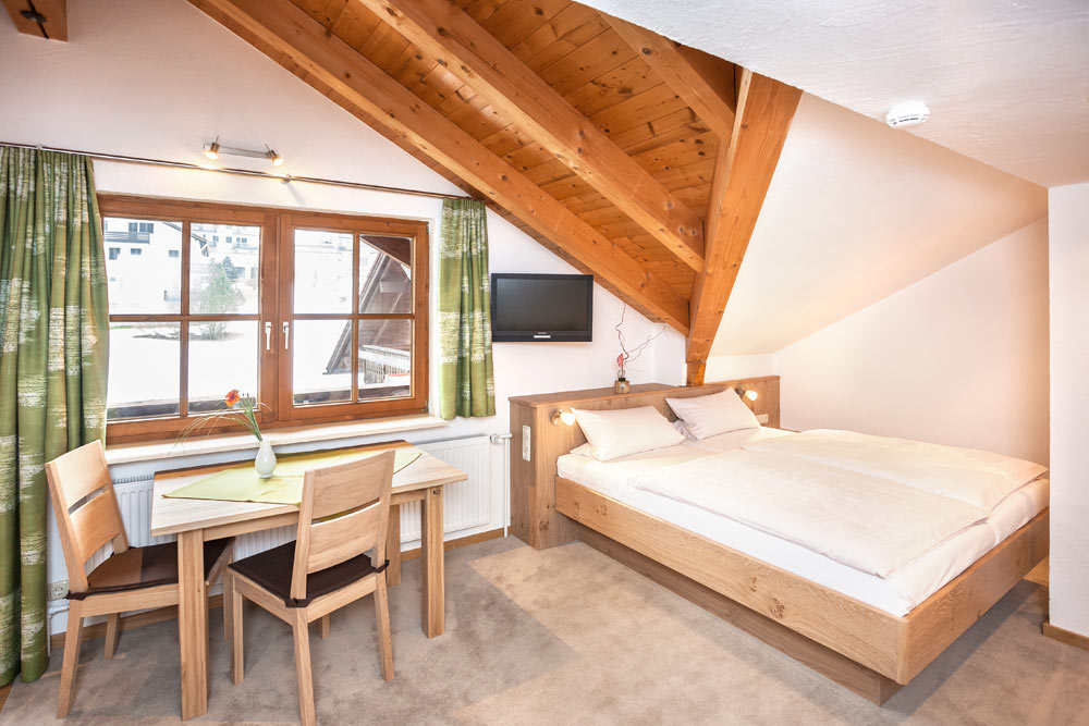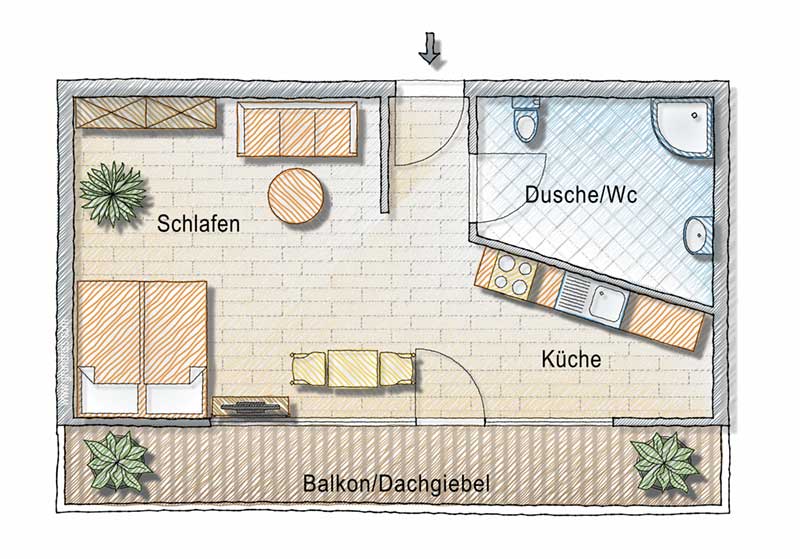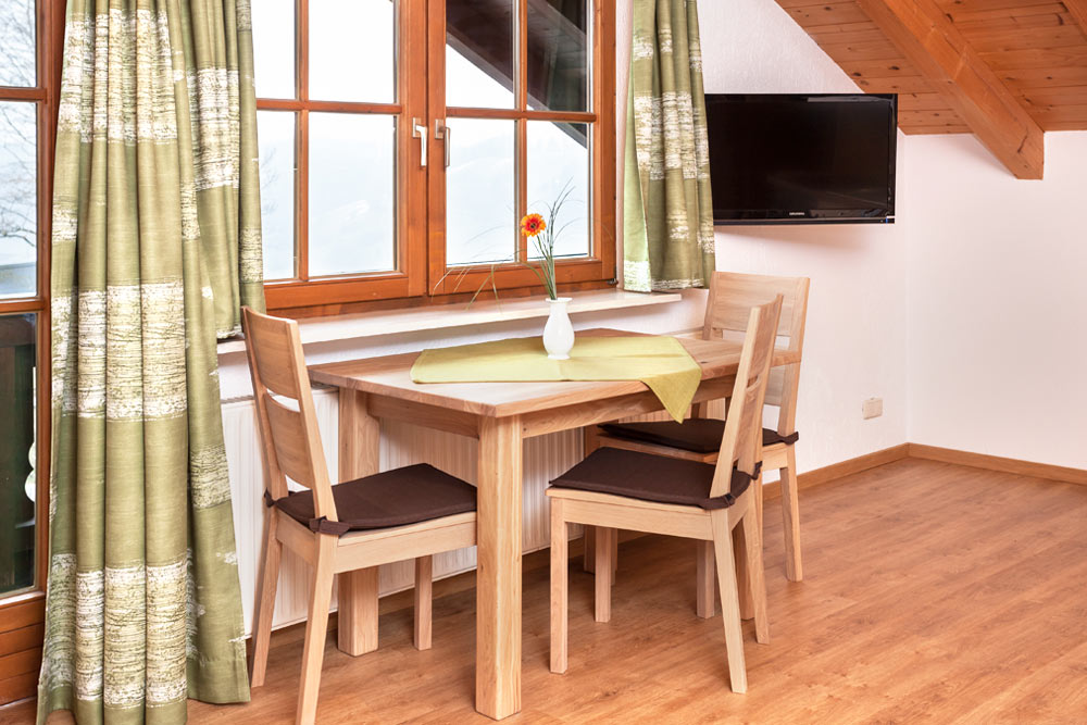 Die Ferienwohnung Ergelweg ist ein gemütliches Dachstudio mit „sichtbarem“ Dachstuhl und Nordbalkon.