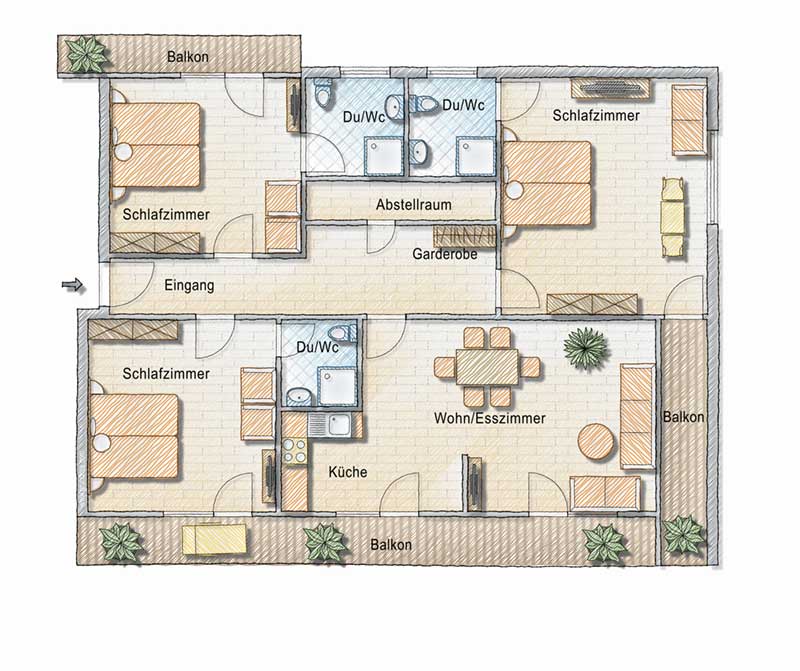 Die Ferienwohnung Nagelfluh bietet Platz für 2 bis 6 Personen und verfügt über einen großen Süd-, Ost- und Nordbalkon mit freiem Blick. Die Wohnung bietet drei Schlafzimmer mit jeweils eigener Dusche / WC, Balkon und TV. Das Wohn- und Esszimmer mit Küche hat zusätzlich einen Balkon und TV. Die Küche ist ausgestattet mit Spülmaschine, Backofen und Mikrowelle.