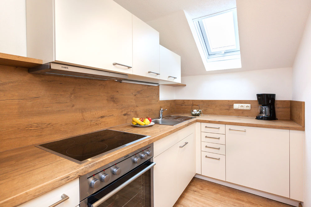 Die gemütliche Dachstudio-Ferienwohnung Hornblick hat einen „sichtbaren Dachstuhl“ und verfügt über einen eigenen Südbalkon. Die Wohnung ist ausgestattet mit einem Wohn- / Schlafzimmer, Küchenzeile mit Spülmaschine, Essecke, TV und Bad mit Dusche und WC.