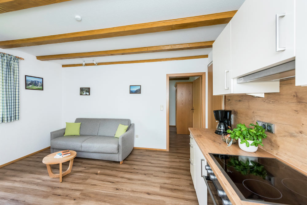 Die Ferienwohnung Grüntenblick liegt im 2. OG mit einem schönen Ost-Balkon und freiem Blick auf den „Wächter des Allgäus“, den Grünten. Sie ist ausgestattet mit einem Schlafzimmer, separater Küche mit Spülmaschine, Wohnzimmer mit Essecke, TV sowie Dusche / WC.