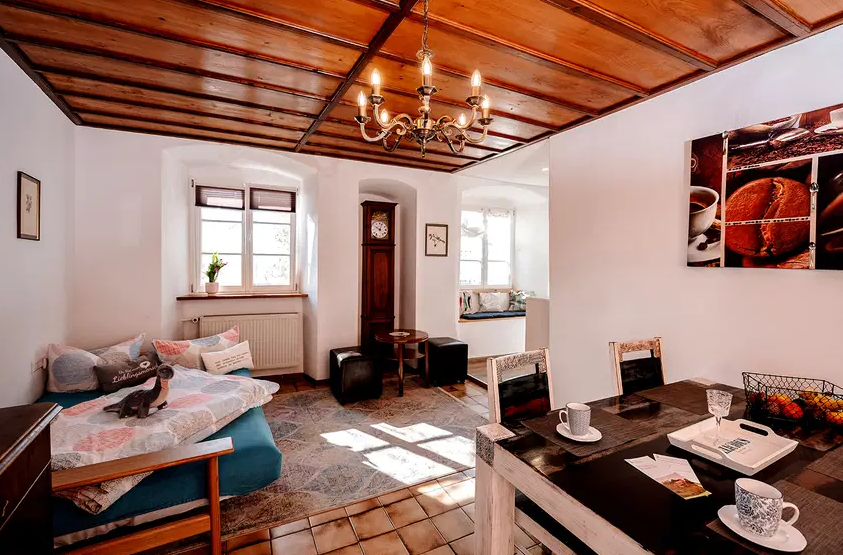 Im ersten Obergeschoss der Burg befindet sich eine schöne Ferienwohnung mit Erker über den Torbereich der Burg. Auch hier sind die Fenster mit herrlicher Aussicht nach Süden ausgerichtet. Der Wohnung ist 65 m² groß und bietet einen großzügigen Wohnschlafbereich mit Doppelbett und Essecke, ein großes separates Schlafzimmer für Kinder (Zustellbetten sind hier möglich), ein Badezimmer sowie eine komplett ausgestattete Küche mit Kühlschrank, Mikrowelle, Wasserkocher, Kaffeemaschine und Geschirr. Die Ferienwohnung bietet Raum für bis zu 6 Personen.