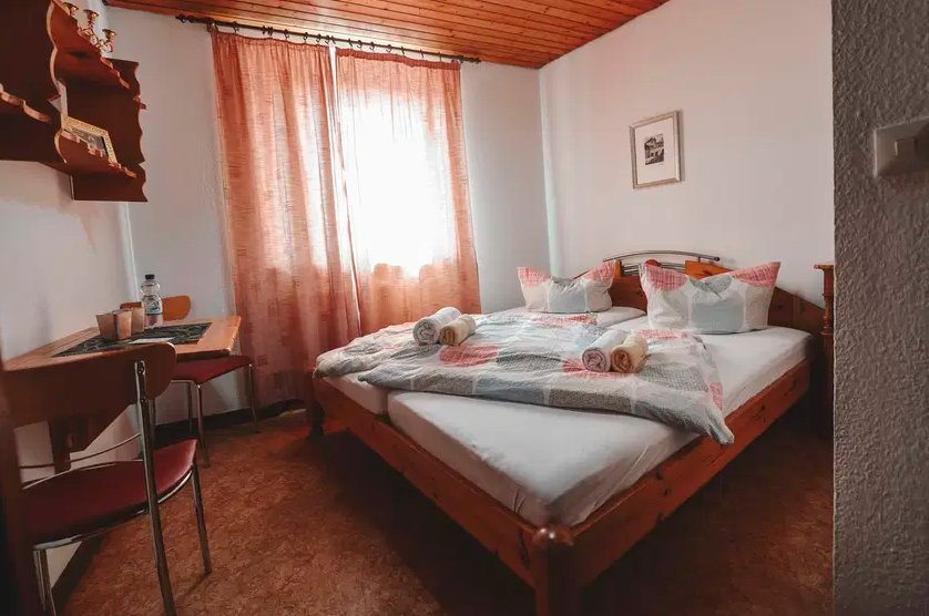Ein Doppelzimmer eingerichtet mit antiken Bauernmöbeln mit Dusche und WC auf der Etage. Von hier aus haben Sie eine atemberaubende Aussicht auf das Obere Bühlertal. Die romantische Anlage mit dem Burginnenhof, der uralten Linde Gundula, dem Turmstüble, der begehbaren Schildmauer, dem Lagerfeuerplatz mit großer Grillhütte auf dem Burgwall und die gepflegten Außenanlagen bieten Ihnen vielfältige Möglichkeiten für Ihre Erholung.